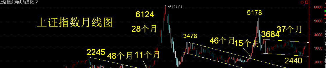 1、3684点下跌到2440点有一条标准的下降通道,经历了37个月时间;