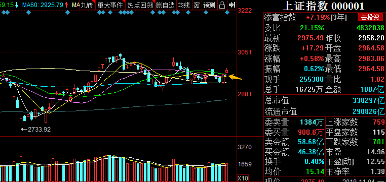盘面上,机场航运领涨两市,而无线耳机概念连续成为市场热点,引领智能音响、消费电子类板块走强。区块链概念股早盘集体大涨,但午后再次出现回落炸板之势。而大医药、天然气、5G等其它板块盘中均有异动拉升表现。从个股整体表现来看,指数涨了不少,个股涨跌比却相差不大,算不上普涨,且涨幅主要集中在5%以内。而涨停板个股也只有33家,赚钱效应并不明显。总体来看,A股延续了上周五的反弹格局,不过还是没有脱离3000-2900点区间震荡,大盘想要突破3000点必须要有成交量的配合。