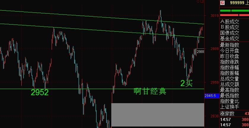 上图5分钟。从3028点开始下跌破了2952点缺口。下跌趋势打开。就在形成第三个中枢时跌到2905点失败了。因为它反弹突破上面二条压力线,到3023点虽然没有破3028高点。但它的下跌趋势己失败了。就在回调在2952点支撑线上形成2买反弹在当下。如果它真的恢复原来下跌趋势。一定先等待这个2买不能新高通过中枢的扩展。但通过属性关系。当下走势是单一结构。今天收盘刚好在第一条压力线下面。走势很强。479关系。这个反弹可能直接突破3028高点。一旦突破就会势如破竹。