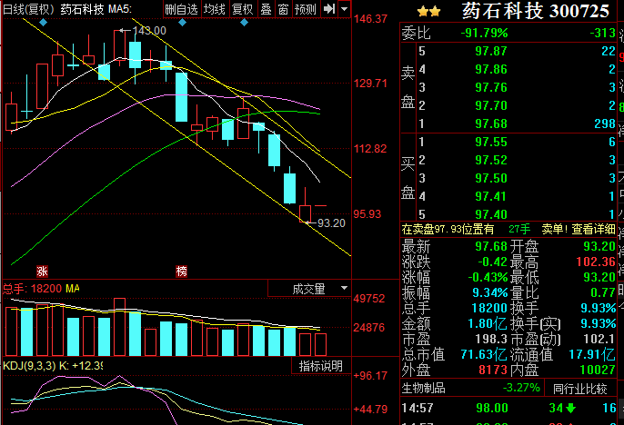 明天,根据情况继续对仓内的个股高抛低吸。明天300725的下轨线位于91元附近(今天在93元附近),根据盘中的走势情况进行操作。