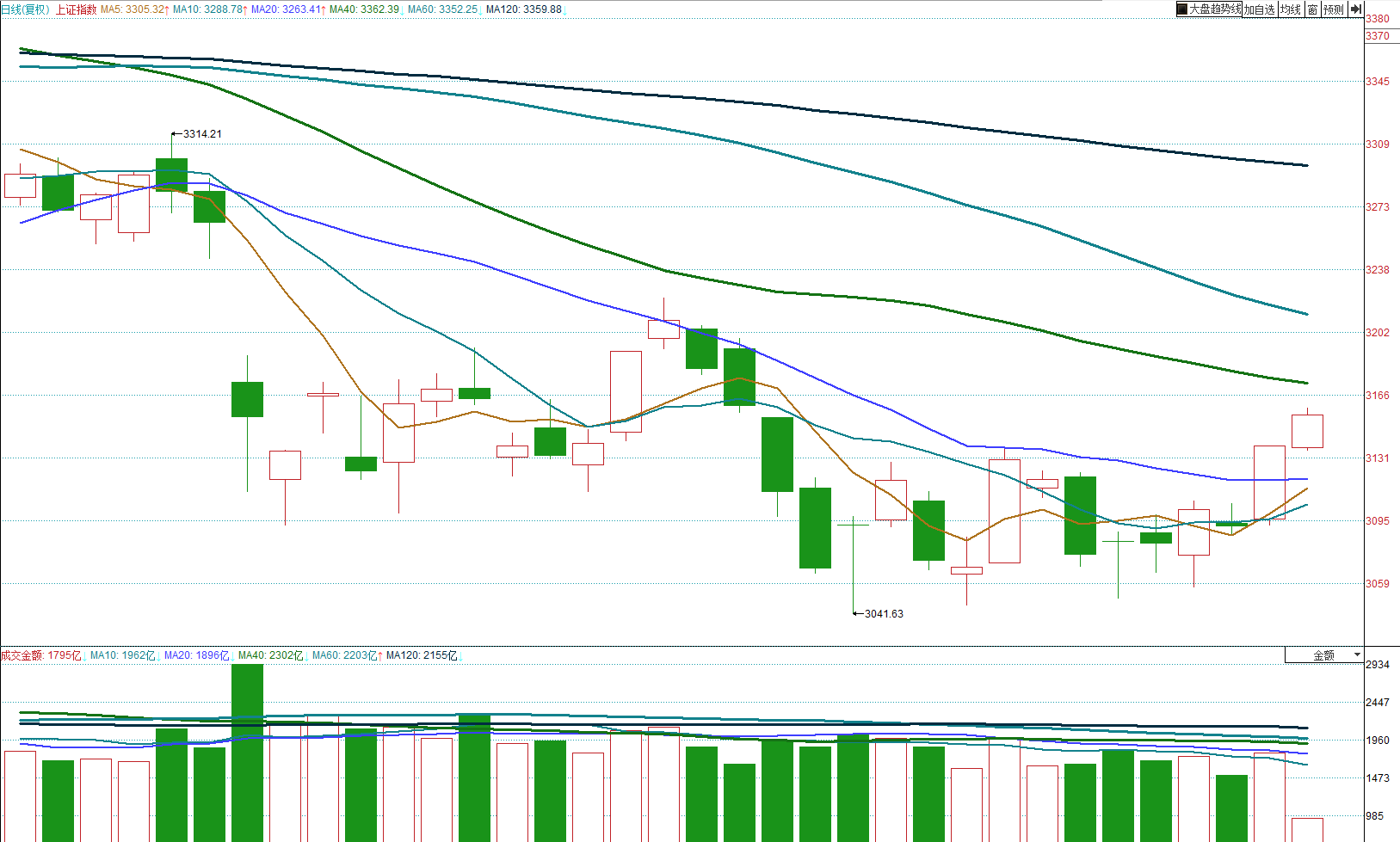 这是趋势的力量,不是谁说了算。所以依照我们对40日均价线的移动关系推演,至少未来2周内不会改变其跌势状态,更长周期的跌势时间会更久一些。可想而知,向上处处有压。