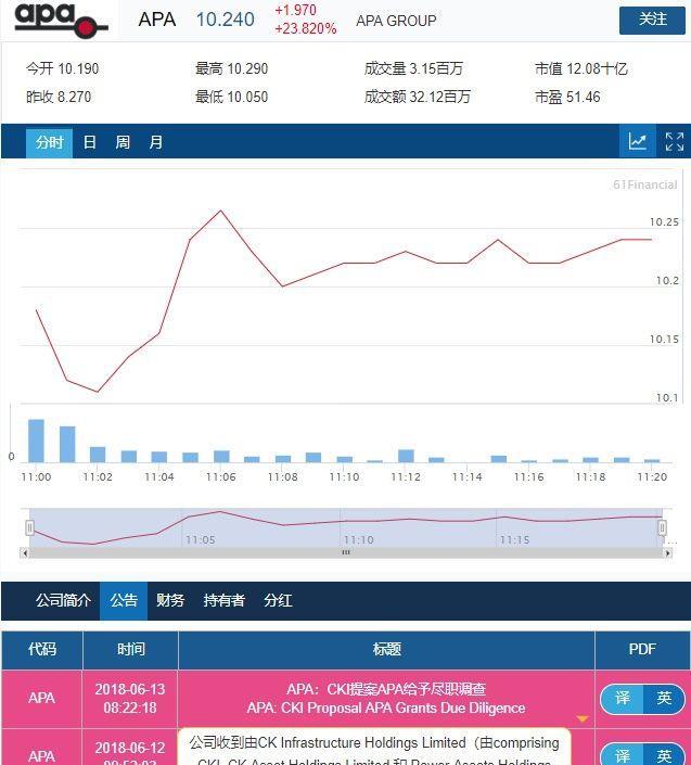 APA开盘大涨,截至发稿前涨幅达到23.82%。