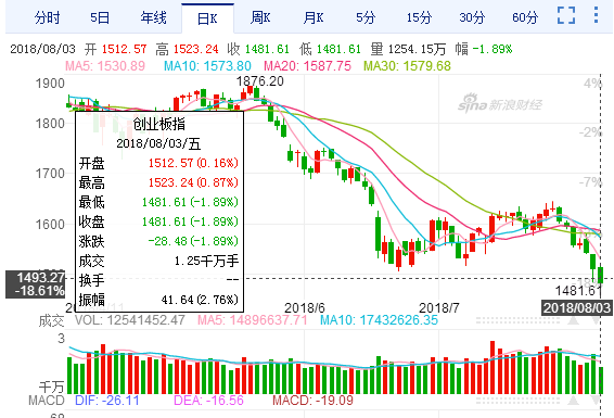 基建板块:分析过,成都路桥作为最早的引导龙头,也才7板的高度。西部创业只有4板半,高度在递减。短期基建板块也难有行情。下图创业板指数日线图