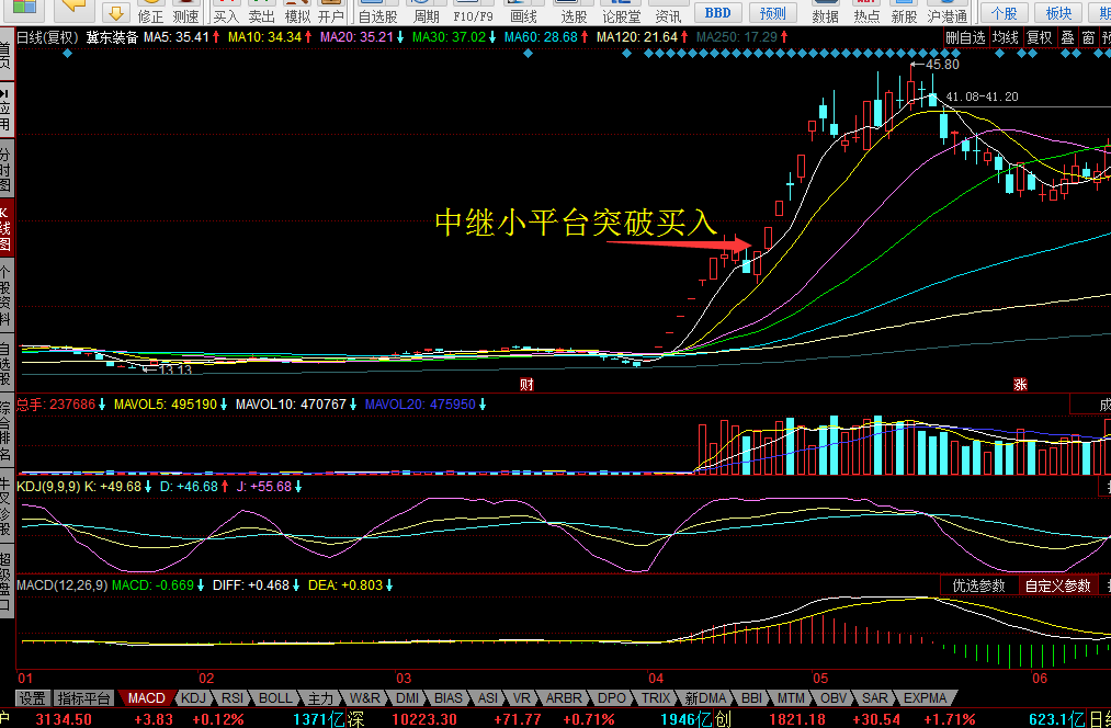 顶部平台突破的,对于长期横盘后的突破,一般会有一个回踩平台上轨过程,这也是介入良机。后市放量拉升,一般会有中级行情。 大家一定一定记死喽,任何平台不突破我们不买进,特别是以涨板板的方式是最猛烈的信号,必须考虑干票。