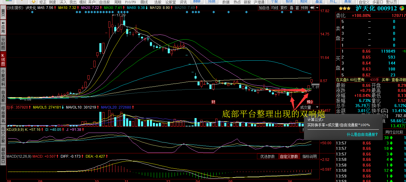 股票价格平台突破时,只要盘中伴随较大成交量,也是盘中较易涨停的位置。平台类型有以下三种: 一是底部平台;二是中继平台;三是顶部平台。今天目前涨停板的都是底部涨停板的多 。底部和顶部平台持续时间长一些,一般一个月以上,中继平台有长有短,横盘时间长的中继平台,后市力度相对弱一些,而横盘时间较短的,尤其是快速拉升过程中,只横盘一周以内的,且5日均价与10日均价线不形成死叉的,这样的上升力度仍延续前期的凌厉涨势,如果前期以大阳或涨停快速拉升的,后市仍以大阳或涨停板快速拉升。