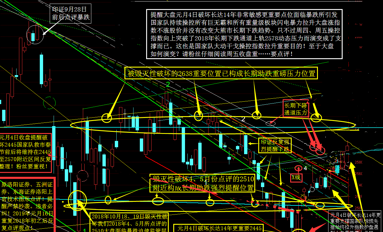 那么国家队为什么“不遗余力”操控指数向上冲击2578重要敏感点呢?原因一国家队操控向上突破2018年我们所点评长期下跌通道上轨2578是为缓解市场长期抛售下跌压力,并可利用2578动态重要支撑作为护盘力量来维稳呵护大盘。原因二国家队不遗余力操控向上突破长期下降通道上轨2578目的是为多多少少缓解前期大盘无数次破坏2638、2510、2445这几个历史罕见非……常重要敏感点所给市场带来的史无前例长期助跌压力!原因三是为配合监管层迫切推动资产证券化为大量“债台高筑”企业提供抛售股权,偿还银行大量债务,来缓解2019年经济下行风险压力更大。避免金融系统更大风险才使国家队付出巨大努力向上突破2578是操控市场真正目的!
