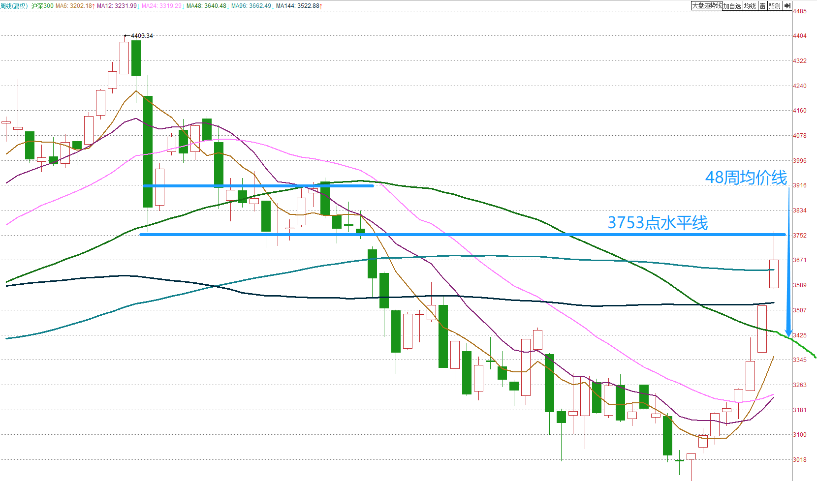 同时,本周指数也已经向上推升到了2018年6月中旬加速下挫的前个平台区域,这个位置也是促使48周均价线转跌的时刻,具有极强的长期趋势引导性,其后持续阴跌超过半年之久。这使得在技术结构上,出现了明显的断层,形成两个显著的分水岭。这个情况我们在前几天的分析中,已经说明了这个情况,此次冲高遇阻回落震荡的逻辑也有此内因。