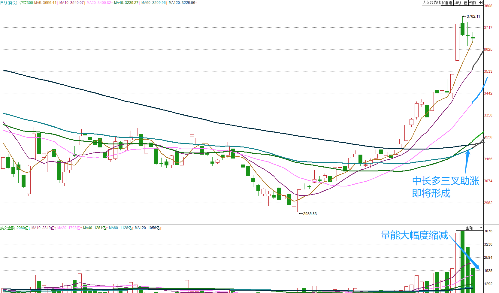首先是成交量能的缩减,幅度还是比较大的,全天量能在3000亿元以上的基础上直接减少到2060亿元,缩减幅度达到32.97%,不过还是没有到极端缩量高达38.2%的比率水平。而如此缩减量能,已经大大降温前几日的爆量行为,回归合理稳健的扩增态势。虽然单位量能缩减,但依然保持区域量潮的稳健扩增,这就是非常好的涨势下的量能缩减。