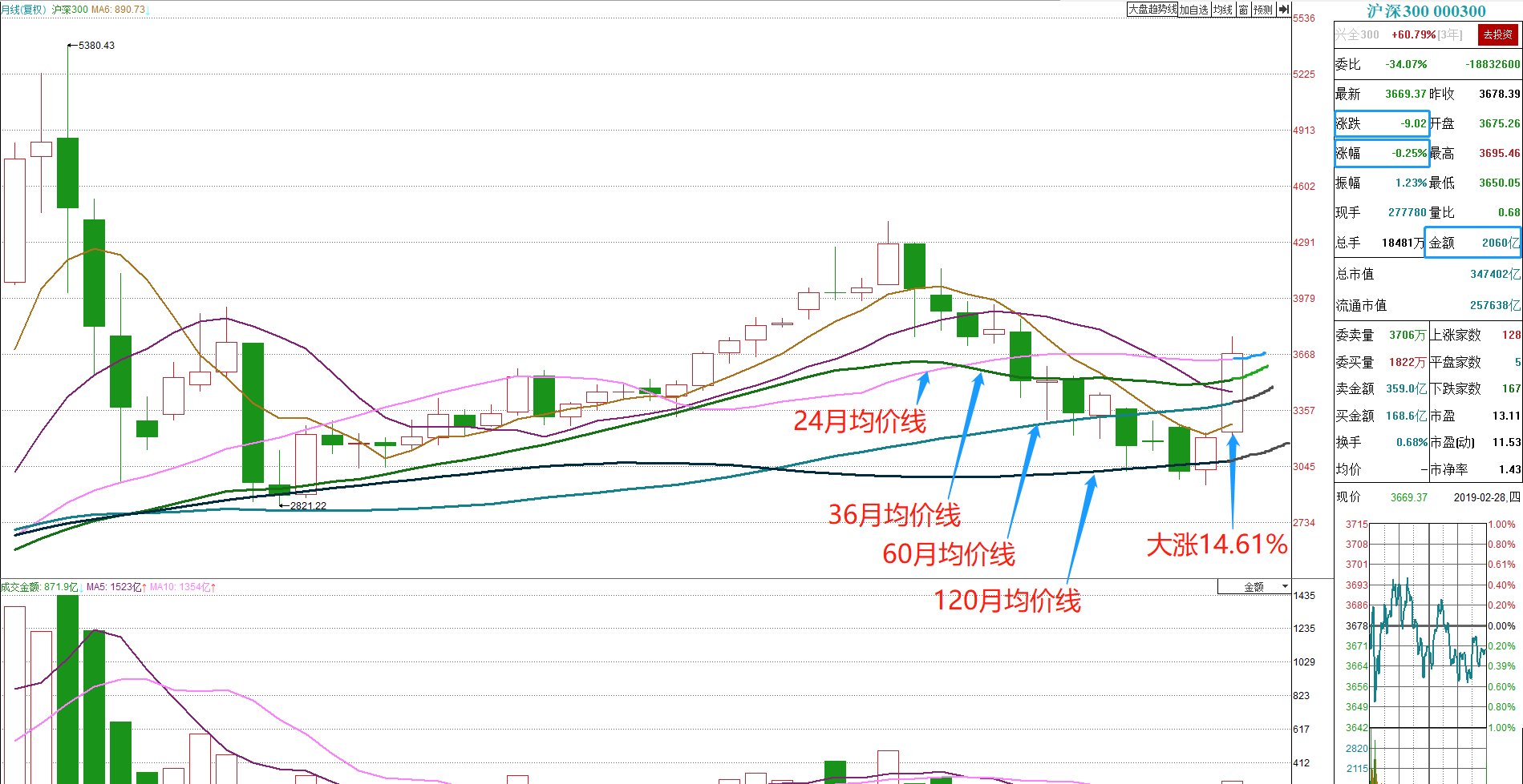 2月份的股市行情,就这样完美收官了,最终使得2月份单月涨幅高达14.61%,一举将指数拉回到10年(120月均价线)、5年(60月均价线)、3年(36月均价线)、2年(24月均价线)等各个月均价线之上,成功扭转过去长达12个月的阴跌行情,实现了多空趋势的大反转。
