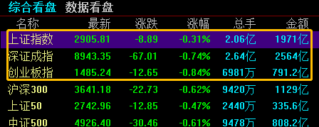 大家好,我是盘之感!A 股两市今日集体低开,开盘后震荡下挫,以国产操作软件、半导体芯片为首的科技股集体杀跌,之后股指开始弱势盘整。午后指数持续弱势下行,近期大涨的稀土、半导体、芯片概念集体熄火,创指一度跌超 2%,但随后股指探底回升,沪指五连阳险守2900,盘面上的赚钱效应较差。截至收盘,沪指报2905.81点,跌幅 0.31%,成交额 1971亿;深成指报8943.35点,跌幅0.74%,成交额 2564亿;创业板指报1485.24点,跌幅0.84%,成交额791.2亿。板块方面,玉米、农业种植、采掘服务板块领涨,国产操作系统、天津自贸区、电子发票板块领跌。个股方面,跌多涨少,两市超2400股飘绿。