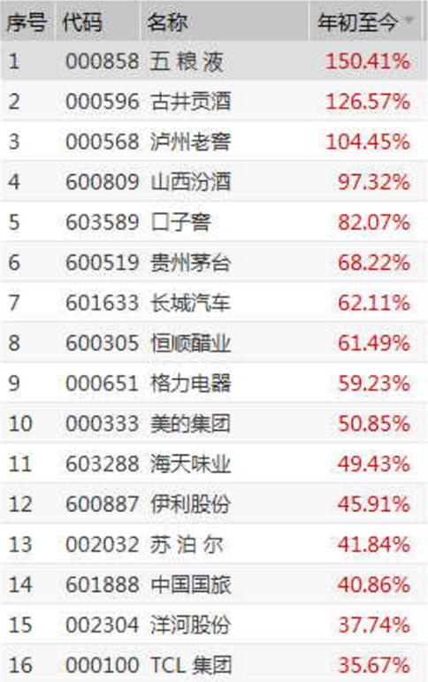 另一个重要原因是,今年以来,以白酒为代表的翠花概念股,领涨两市,成为市场大赢家,五粮液累计上涨150%,古井贡酒、泸州老窖均实现100%以上涨幅,山西汾酒涨97%,口子窖、贵州茅台等涨幅均在60%以上。
