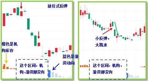 先说“放任式反弹”为什么要躲开。原因就是,放任式反弹里,没有大资金在里面积极动作,反弹就很难有持续上涨的预期。在我用的博尔系统中,对大资金的行为,可以量化成两类,一类是机构行为,称为“机构库存”,一类是游资行为,称为“游资动向”。而有些反弹,“机构库存”、“游资动向”都没有,那么无论是做波段也好,还是做短线也好,多没机会。下图大家一看就明白。