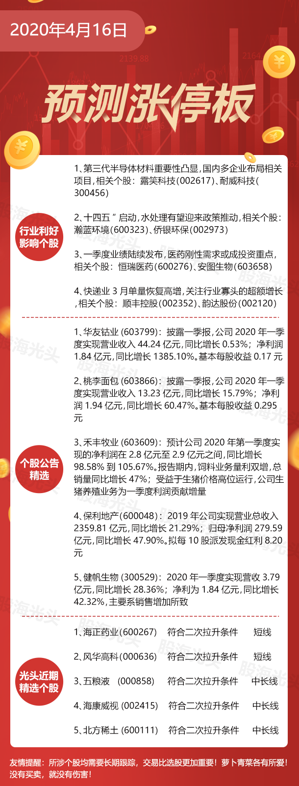 2、桃李面包(603866):披露一季报,公司2020年一季度实现营业收入13.23亿元,同比增长15.79%;净利润1.94亿元,同比增长60.47%。基本每股收益0.295元。