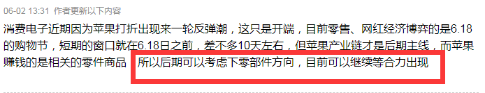 午后资金继续回流科技股,京东方A拉升创本轮反弹新高,TCL科技涨4%,歌尔股份、立讯精密、科大讯飞等科技白马大涨;核心还是炒的中报业绩预期:一季报时,因为业绩好,资金就炒过一波科技股;现在随着二季度即将结束,中报业绩预告也会陆续出炉,市场预期科技股的业绩还会继续增长。