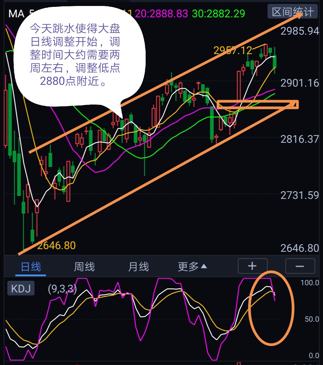 今天大盘午后跳水的主要原因是来自外围市场率先跳水,特别是美股期指出现大幅度杀跌,引发日本、港股出现大幅度杀跌,然后传导到富时50指数跟随跳水,当然外围市场全线杀跌是诱因,更主要的是我国内部因素造成的,我们股市本来比较疲软,最近一段时间涨幅远远落后于外围。第二个原因就是券商午盘前拔地而起,午后跳水时同样没有抗住,相反杀跌更凶,如此情况之下岂有不跌之理。不过我国股市最近没有出现大幅度拉升,因此杀跌空间有限,从纯技术上看,短期震荡回落格局,20、30日均线应该有强烈支撑,同时这里也是突破性缺口处,双重支撑位2880点附近。沪指上下都有缺口的震荡格局不会改变,调整第一目标位就是2880点,第二目标位就是缺口29855~2971点,第三目标位就是上升趋势线下边支撑位。