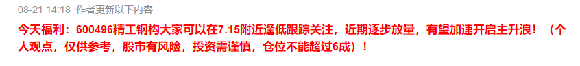 有时候这里要审核,延迟更新,有时牛哥写的内容经常延迟10分钟才更新出来的,这样就容易造成我发布的时候跟大家看到的时候泄后,,所以牛哥对精工的后期目标点位规划,操作策略,还有新的大潜力标的今天我会更新在精工钢构的涨幅里面,