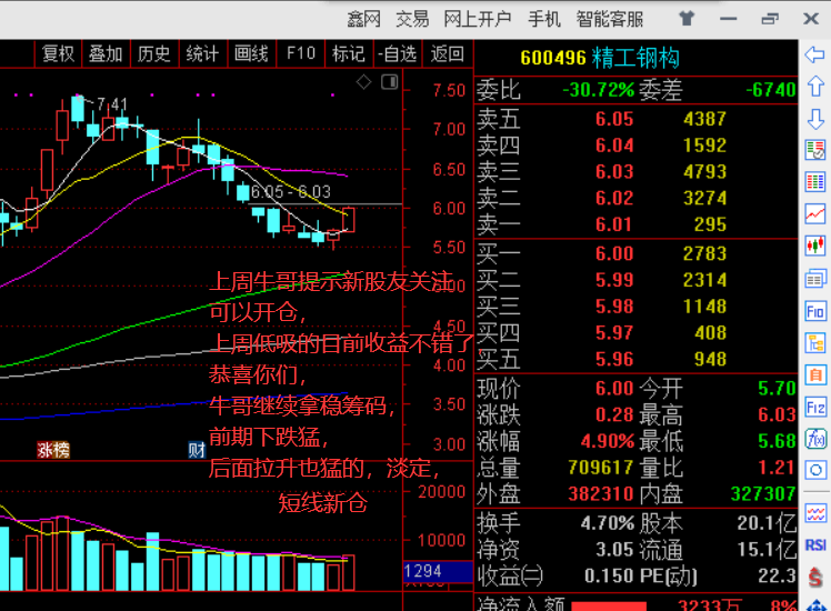 最新跟踪提示:短线止盈了沙钢股份,短线新仓精工钢构,,,上周五牛哥晚评的原话:今天连续急跌得到了缓和,很明显是跌不动了,,是很不错的信号,资金有从创业板转移到沪市的迹象,牛哥觉得精工很快就有大涨了,新股友,新粉丝,还有有多余仓位的,明天开盘之后可以逢低开仓的,有些股友成本比牛哥还低,,大家都还记得吧?大家可以去回看上周五牛哥晚评,牛哥相信有看到牛哥说的低吸进去都已经开始盈利了,恭喜,,今天精工整体表现不错,底部越来越扎实,,对了,大家关注牛哥之后每天必须看白天的文字解盘,就在我主页,每天都会更新,同时晚上晚评也要看,每天观点与策略都会提示的,如果你没有及时看踏错节奏就不能怪牛哥,精工大家都等着看牛哥笑话?呵呵,后面看打谁的脸哦,走着瞧,这里震仓洗出一部分不坚定筹码,精工急跌就是机会,如果你们嫌弃无聊,可以反复做t,牛哥就不折腾了,直接加仓之后拿稳不动了,,今天这走势影响不了牛哥持股的信心,不到目标我就一直拿着,拿好拿稳筹码,,跟紧牛哥提示,,,期待继续表现,,,,,大家可以去查看的,关注好牛哥每天直播提示就好了,关注好牛哥每天直播,有短线机会就放给大家!,,,关注好牛哥解盘提示就好了,锁定好牛哥每天解盘间,大家可以往回一一查看记录!好了,今晚复盘就这样,要是觉得内容还不错,顺便点个赞!当然,牛哥只提供逻辑,最终的决策只能靠你们自己,请勿胡乱无脑跟风!如果你喜欢牛哥就点个赞支持!